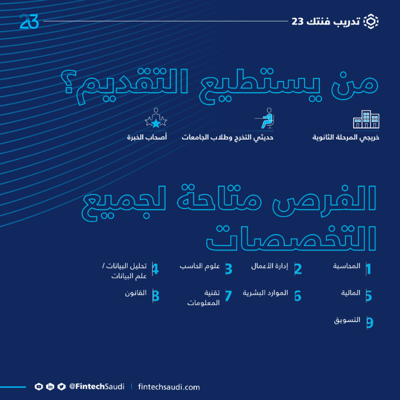 فنتك السعودية إحدى (مبادرات البنك المركزي السعودي) عن فتح باب التسجيل لبرنامج تدريب فنتك 23 في نسختها السادسة كجزء من جهودها المستمرة لبناء الكوادر المؤهلة وبناء المهارات والقدرات المطلوبة في سوق العمل لقطاع التقنية المالية، وذلك وفقاً للتفاصيل الموضحة أدناه.